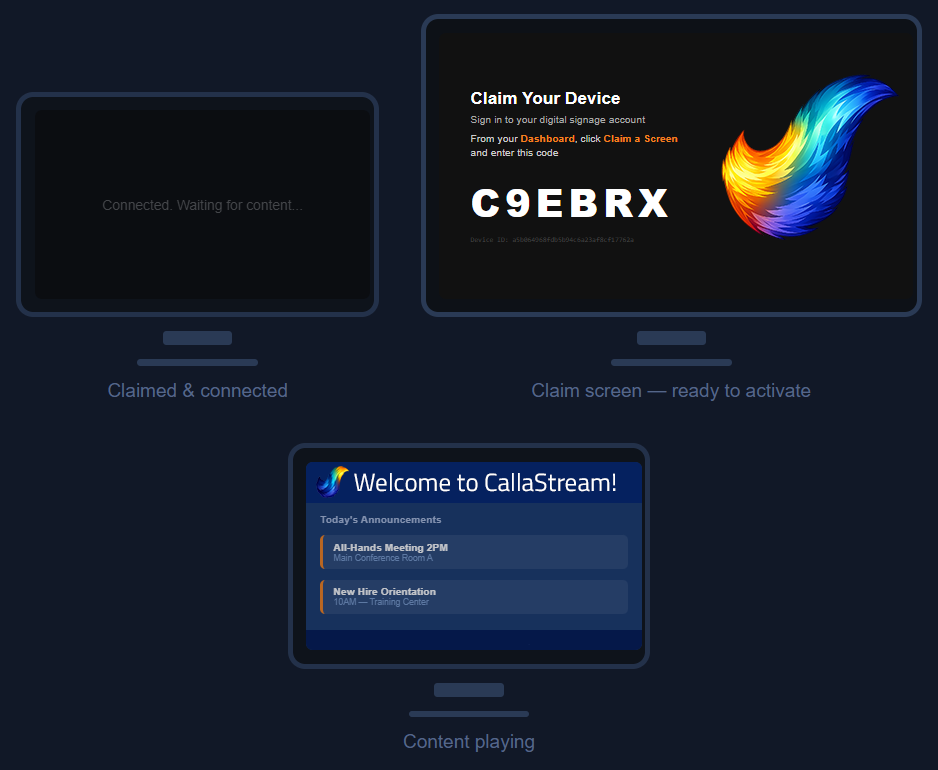 Install the app, enter the 6-character code in your dashboard, and the screen is live. No IT expertise needed.